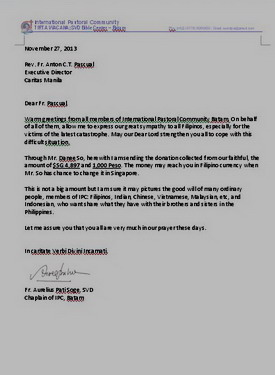 THE MELODY of "Touch The Philippines" accompanies the fund collection for the victims of Yolanda Typhoon, Sunday, November 17, 2013, at Bible Centre, Sukajadi Batam. The catastrophe that hit the Philippines inspires many Sunday worshipers to donate something for emergency aid of the victims. Initiated by some Filipinos expatriates, currently working in Batam, the IPC (International Pastoral Community) Batam organises this fundraising by the end of Sunday Mass. The fundraising is continued the following, Sunday, November 24. The two collections makes total amount of Rp 39.350.000, $SG 742,2 and Piso 1.000,- This amount is sent to the Caritas Manila, a Catholic agency that is very much involved in this emergency aid. After some other donations and currency change to Sing Dollar, the total amount sent to the Agency is $SG 4,897 and Piso 1,000. In his letter addressed to Caritas, Manila, the Chaplain of IPC Batam, Fr. Aurelius Pati Soge, SVD, writes, " This is not a big amount but I am sure it may pictures the good will of many ordinary people, members of IPC: Filipinos, Indian, Chinese, Vietnamese, Malaysian, etc, and Indonesian, who want share what they have with their brothers and sisters in the Philippines. Let me assure you that you all are very much in our prayer these days." The parishioners respond well to the aid program and donate something out of their own needs. A generous man - asked to be unnamed - even donates amount of Rp 30,000,000 (thirty million rupiah). "I wish we could distribute food, clean water, clothes, temporary shelter and medicines directly to these people", he says. "Hopefully our small contribution will bring some relief to them."(ap) |