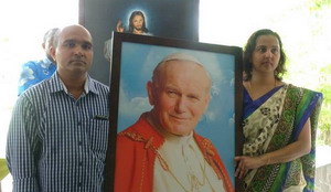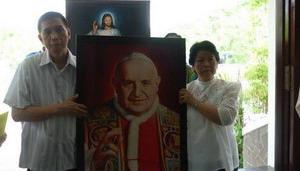 Two New Saints Prior to the holy mass, the introductory part is marked by a procession. To begin with, pictures of two new saints, due to be canonized today, St. John XXIII and St. John Paul II, are enthroned. Mr. and Mrs. Caesar, Filipinos, lead the procession with the picture of St. John XXII, followed by Mr. and Mr. Ajo Tomas, Indian, with the picture of St. John Paul II, each accompanied by audio meditation by Fr. Aurelius Pati Soge. Pope John XXIII was the man behind the Vatican Council II, an enormous step to the renewal of the Church in modern history. “Open the windows and let the fresh air come in”, said Pope John XXIII, initiating the council that has change the shape of the world since. He encouraged men and women to step into the world, being engaged into all aspect of human lives, to help the society to define its true identity. The Council proved to be a major wind of change that brought the new hope to the world. Meanwhile, St. John Paul II is considered the major executor of this renewal. In 1978, this Polish Cardinal, Karol Józef Wojtyła, was elected pope, who chose to be named John Paul II. Like a megastar he travelled around the world to send the messages of peace, harmony and unity among nations. He played the crucial roles of cracking down the communism, which led to the establishment of many new states for sovereign nations. The most touching part of his spiritual endeavor was to build the bridge between social, political and religious differences. No surprise, as the world for once witnessed, that his death had gathered all political opponents, even bitter enemies, around his coffin, as they eventually realized, that the world would be poorer at the departure of this great man. He was the one that brought the Divine Mercy Devotion to the spotlight of Christian heritages. |