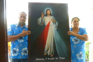 The image of Divine Mercy Mr. and Mrs. Dretivoni, Fijian couples, have the honor to bring the picture of the Divine Mercy. One decade of chaplet of Divine Mercy is musically recited when the picture is being brought along the alley. The congregation spontaneously rises up and faces the image of the Divine Mercy, singing the chaplet, creating a glorious moment of solemn procession. The Divine Mercy devotion comes to the stage through a Divine revelation to St. Faustina Kowalska, a polish nun. This simple and quite uneducated nun certainly did not think of having an extraordinary contribution to the spiritual life of the Church. She recorded the whole vision in her diary, and later related her spiritual experience to the attention of many. Thanks to the spiritual openness of the late Pope John Paul II, who helped developing this devotion, which has been proven since to be one of the most popular spiritual movement in the church. This is the reason, why the canonization of the two new saints takes place on the Divine Mercy Day, partly to honor the great promoter of this devotion, John Paul II. .... NEXT |