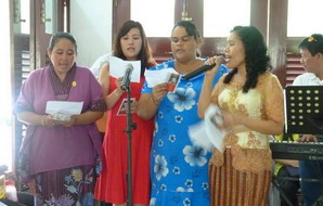 Colorful liturgy The international children choir makes a great contribution to the solemn celebration. All volunteers are dressed in tradition costumes, such as Anwin Francis, the commentator, Mr. and Mrs. Da Cruz, the lectors, all dressed in Indian style. Singers from three different groups come up with three songs in three different languages: Indonesian, Tagalog and Hindi. The leader of Singaporean pilgrimers, Brother Francis, then gives a short talk about the Divine Mercy devotion and invites everybody to make this devotion a part of common spiritual journey. And from now on, this devotion is one of prioritized devotions in the Bible Centre, and will be included in every Frist Friday Mass to honor the Sacred Herat of Jesus. Needless to say, this colorful celebration has been well organized by a committee of four: Ms. Nur Rahayu Pujiastutik, Mr. Anwin Francis, Mr. Ajo David Tomas and Mr. Jojo Castaneda. (ap) |