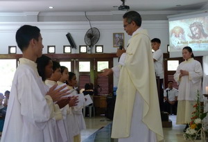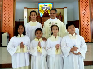 ONE GOAL of involving children in various ministries at International Pastoral Community (IPC) of Bible Centre, Batam, is to educate our children according to the Christian faith and morality. Children of IPC involve in reading ministries, music ministry and altar ministry. They are from anywhere, both expatriates or Indonesian, as long as they want and commit to serve Christ and his church, they are admitted to these several ministries. On the solemnity of Jesus Christ, the King of the Universe, November 22, 2015, five new knights and lilies - as they are called - are admitted to the ministry of serving the altar. They are Roswita Lucy Beoang, Maria Clarin, Faustina Zahra Virginia Nabila, Ezra Putra Setyadi and Leonardo Edwin. After intensive training and special catechism related to the virtues of serving the altar, they are ready to commit themselves to the ministry. In his brief introduction prior the installation, Chaplain of International Pastoral Community, Fr. Aurelius Pati Soge, reminds them all, that serving the altar is free choice but requires commitment and sacrifices. For that reason, family support is important, so they will see that their ministry is meaningful, not only for themselves but also for their family members.